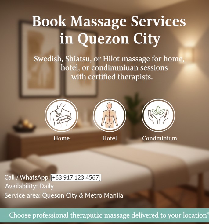Book Swedish, Shiatsu, or Hilot massage in Quezon City for home, hotel, or condominium sessions with certified therapists.