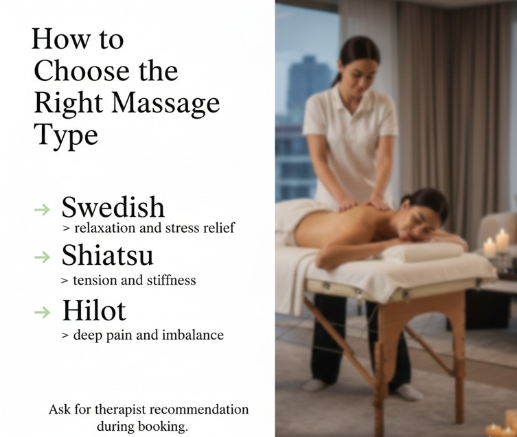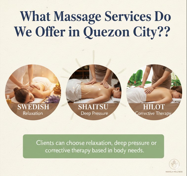 We offer three primary therapeutic massage types in Quezon City: Swedish, Shiatsu, and Hilot. Each massage uses different techniques and pressure levels to address specific physical conditions and wellness goals.