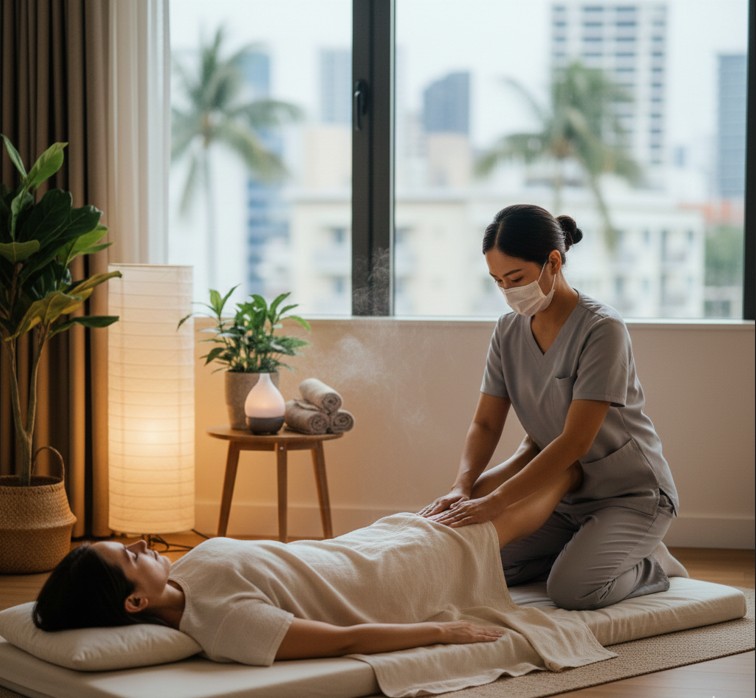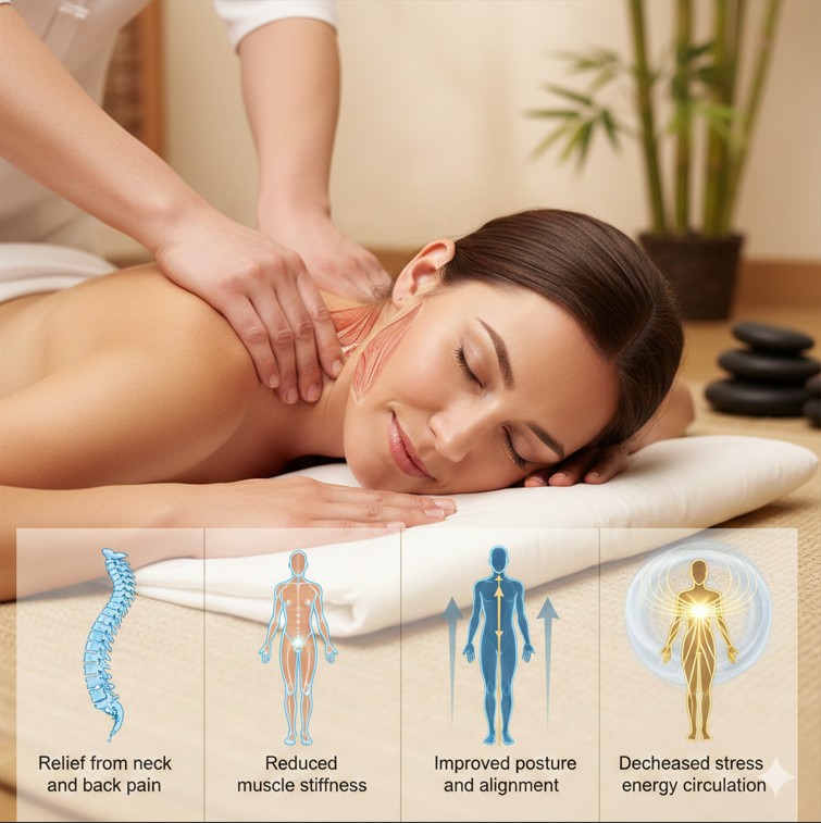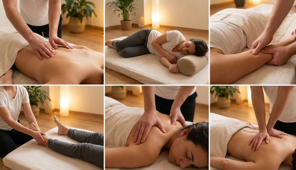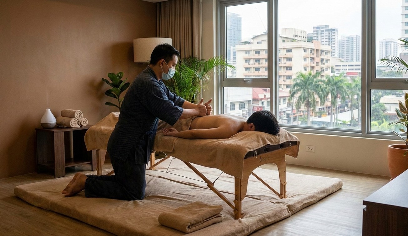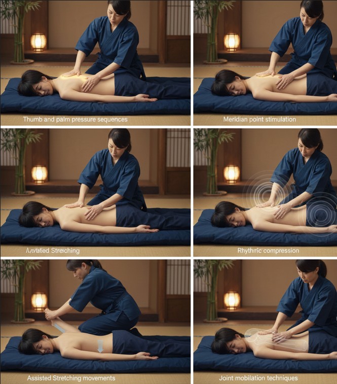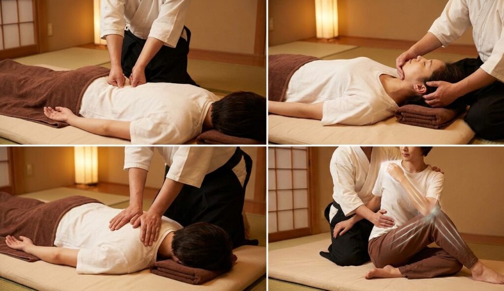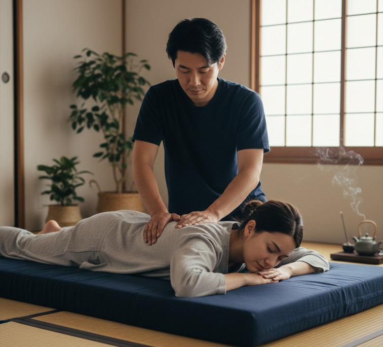 Shiatsu massage is a Japanese bodywork therapy that applies sustained finger, palm, and thumb pressure on meridian points to regulate energy flow (Qi) and relieve physical tension. The technique combines acupressure, gentle stretching, and rhythmic compression without oils.